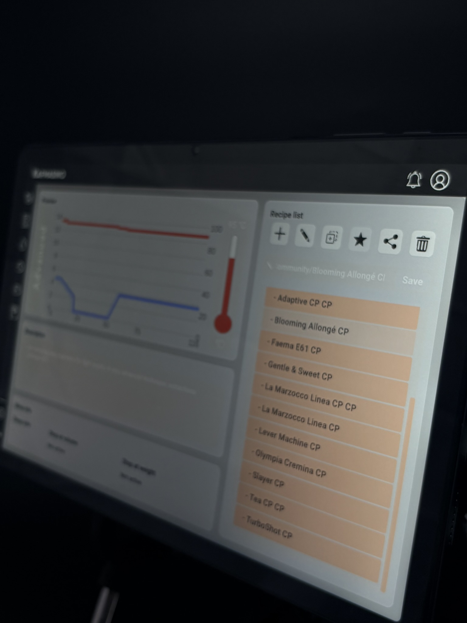 To extend the functionality of your KUBO machine you can design your own recipes. Apply pressure/flow profiling at every step and emulate any machine on the market: lever machine, La Marzocco™, Slayer®… KUBO comes pre-installed with more than 10 recipes that allow you to play with each bean and roast level. In addition, from the community section you will be able to get new recipes shared by community users.
